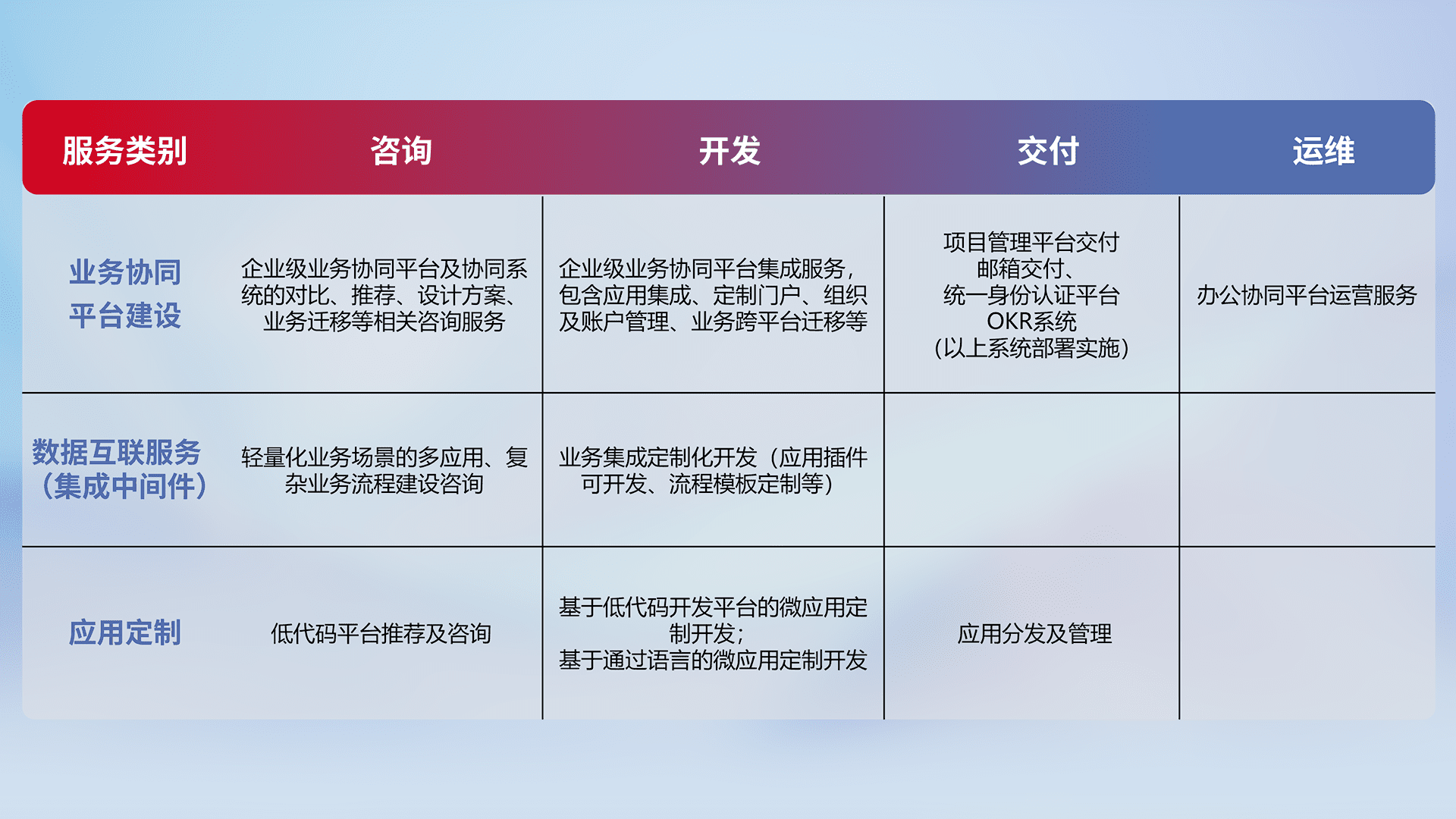针对钉钉、、、企微、、、、IDaas等平台级产品提供产品的规划、、、、方案、、交付、、、定制化开发等服务,,,实现如统一协同办公、、智能客户服务、、混合会议管理、、智能数据查询、、、等业务场景,,,,实现数字化转型。。。。
